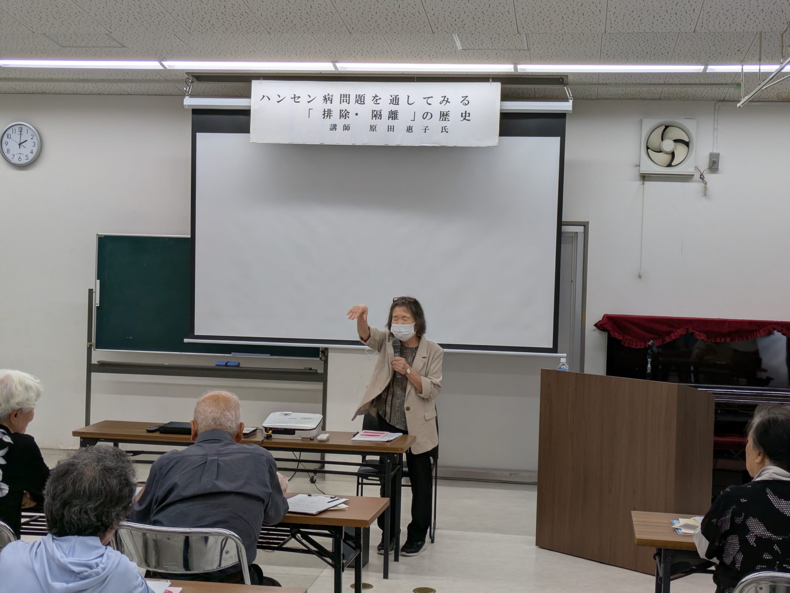 ハンセン病市民学会事務局次長の原田惠子さんを講師にお迎えし、ハンセン病問題についての講演会を行いました。映像資料やレジュメを用いて丁寧にお話しいただき、参加者のみなさんも熱心に聴いておられました。