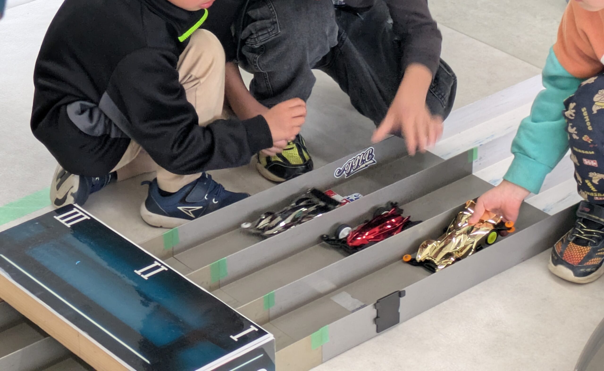 ミニ四駆を作った後はみんなでコースを走らせます。想像以上にスピードが速く驚きましたが、子どもたちは自分のマシンを走らせてとても楽しそうな様子でした。知らない子同士で交流を深めている様子も見受けられ、楽しい時間を過ごせたかと思います。参加いただいたみなさまありがとうございました。
