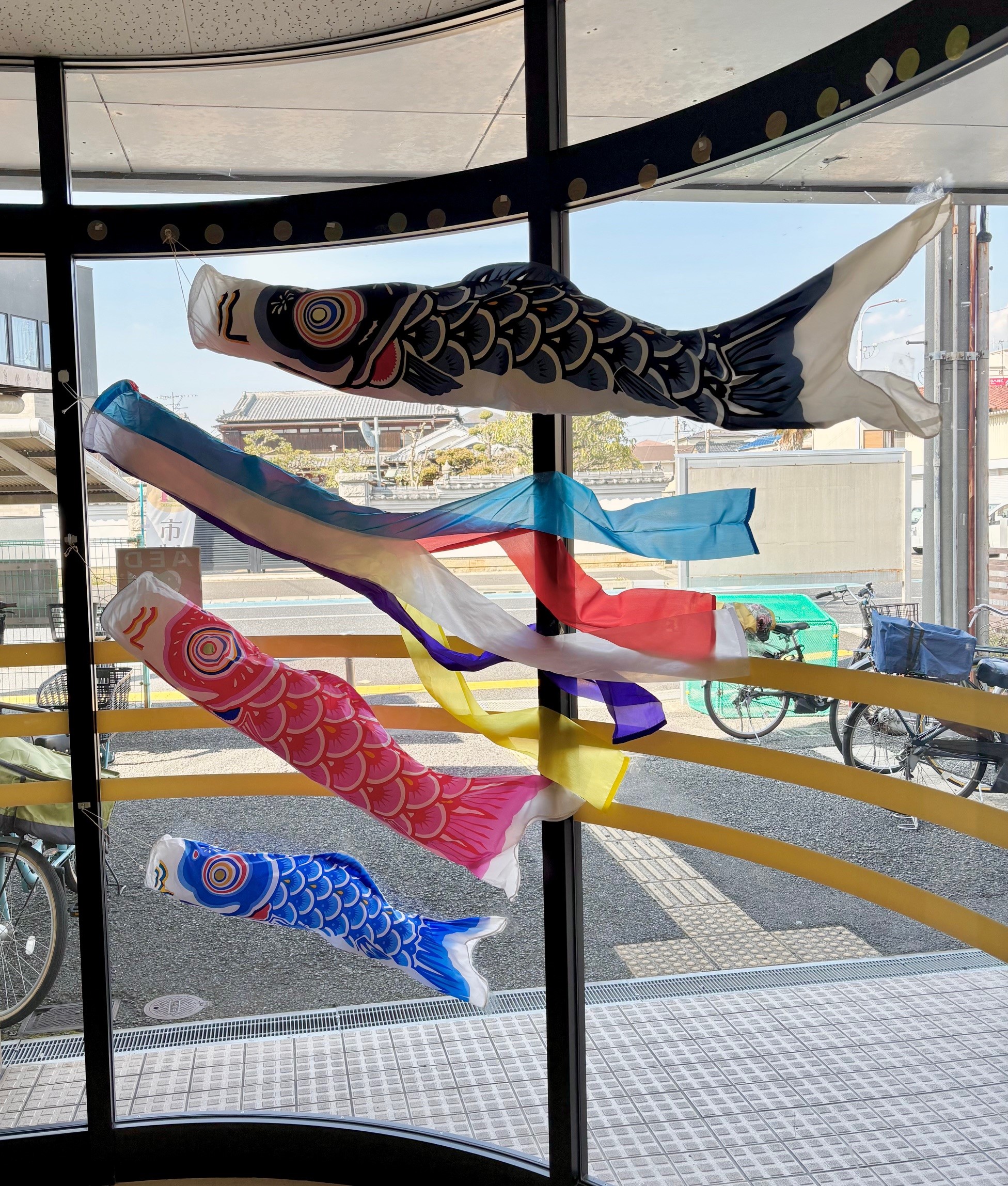 5月5日のこどもの日に向けて、五月人形と鯉のぼりを展示しております。